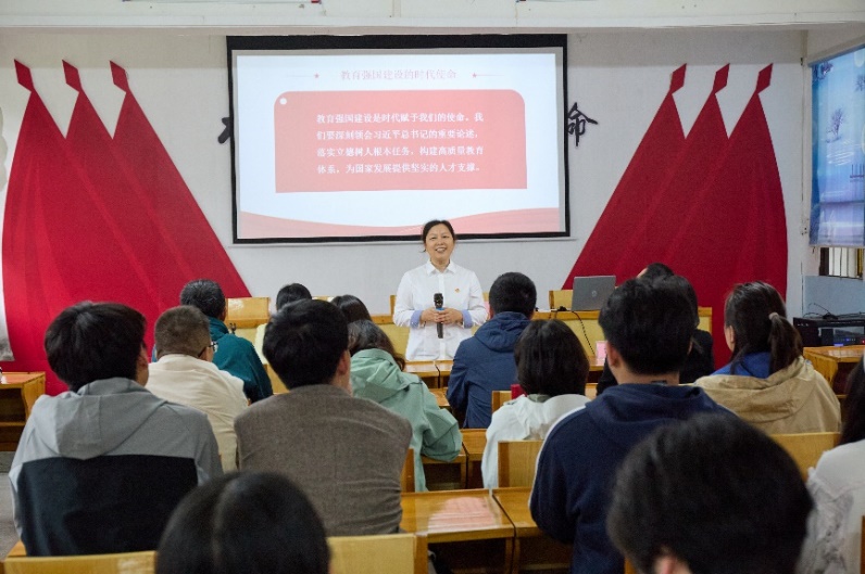 随后,马萍教授讲授微党课《党建引领 加快建设教育强国》。她深入阐释了习近平总书记关于教育的重要论述,并结合《教育强国建设规划纲要》精神,解读了到2035年建成教育强国的总目标,以及“两步走”战略与九大重点任务,深刻阐述了教育在国家强盛与民族复兴中的基石作用,突出党建引领在教育现代化进程中的核心作用,号召大家共同为教育强国的目标而奋斗。