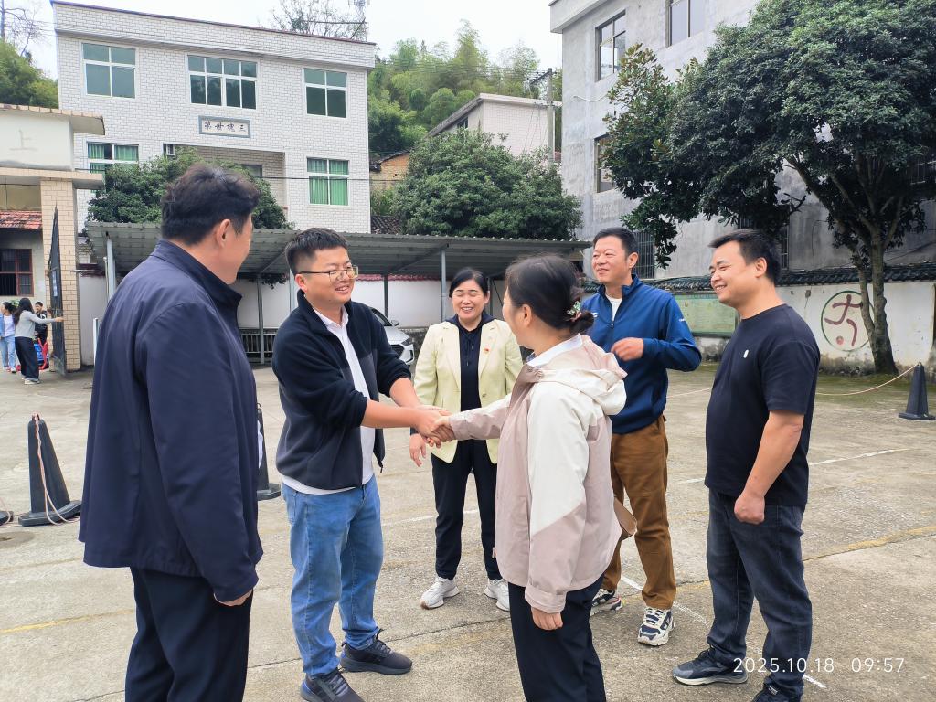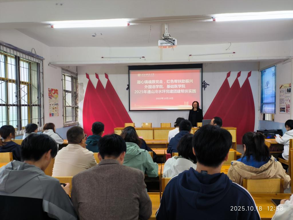 (通讯员:闻琳 周婧 审稿人:佘翠华)2025年10月18日上午8点,湖北科技学院外国语学院师生党支部与基础医学院教工党支部全体党员,在外国语学院党委书记佘翠华和基础医学院党委书记程梦琳的带领下,共同前往咸宁市通山县厦铺镇,深入乡村义务教育薄弱学校——翠屏小学,开展教育帮扶活动,并在冷水坪村党支部举办党建团建实践活动,以实际行动助力乡村教育发展与乡村振兴。