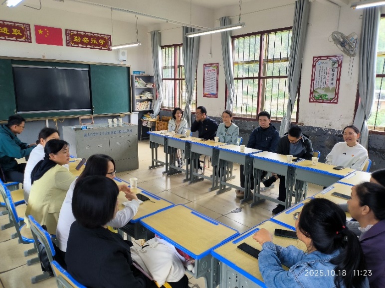 同时,党员教师代表与翠屏小学的校长和教师代表举行了座谈交流会,深入了解乡村义务教育阶段教育教学所面临的诸多困难,如:学生数量减少,贫困学生较多;师资力量薄弱、且流动频繁;专业不对口现象普遍,英语教学缺乏系统指导;英语教学资源匮乏,教学方法亟待提升;教材难度不适配,与乡村学生实际基础脱节;配套教学资源不足,备课压力大;尽管多媒体硬件已基本配备,但教师信息化教学能力仍有待加强等问题。
