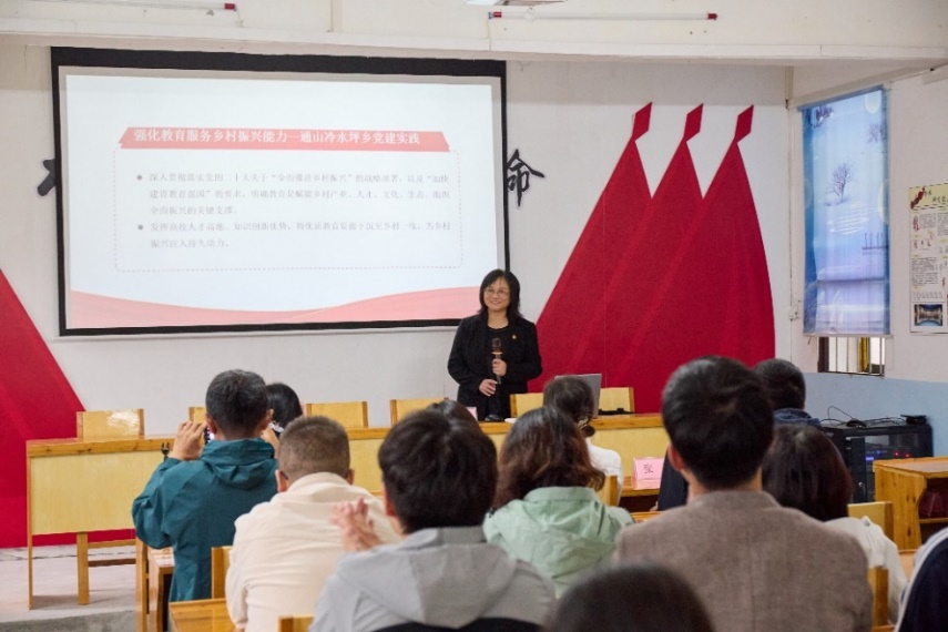 下午一点左右,全体党员到达冷水坪村党委会,在冷水坪村党支部举办党建团建帮扶实践活动。首先,基础医学院形态学教工党支部马萍教授分享全国样板党支部建设经验,提出坚持“围绕教育抓党建,抓好党建促教育”的核心原则,强调党支部要在立德树人、教学科研、人才培养、社会服务等方面发挥引领作用,成为教书育人的楷模、学科建设的先锋、科学研究的平台、人才培养的基地、服务社会的纽带,以党建与学科建设深度融合,激发党员创造性,增加党员归属感,充分发挥党支部战斗堡垒作用和党员先锋模范作用,为团队建设提供坚强政治保障。